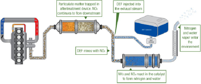 Simply put, SCR is the method by which DEF is mixed with exhaust to convert NOx into the common atmospheric gases; nitrogen and water vapour.